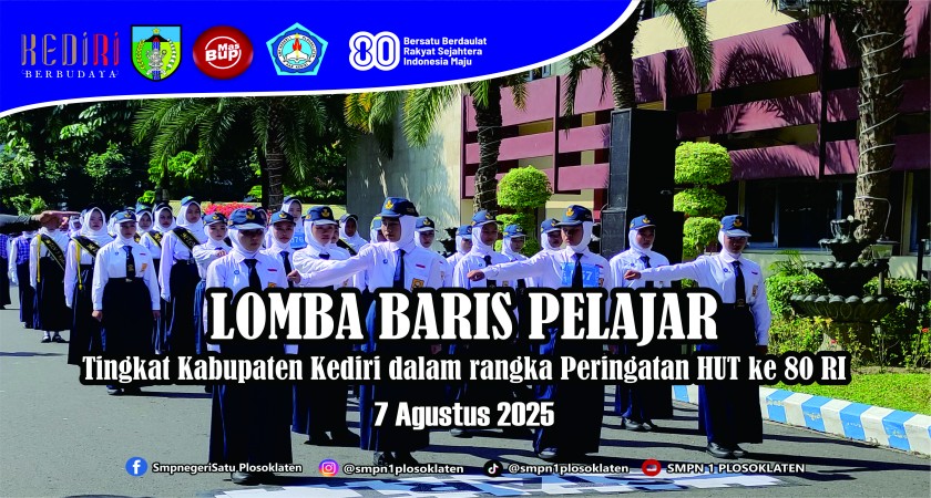 Dalam rangka memperingati HUT ke-80 Republik Indonesia, SMPN 1 Plosoklaten turut serta dalam Lomba Baris Pelajar tingkat Kabupaten Kediri. Meski belum berhasil meraih gelar juara, keikutsertaan ini menjadi pengalaman berharga bagi para siswa. Mereka telah berlatih dengan penuh disiplin, kekompakan, dan semangat kebersamaan, sehingga mampu tampil percaya diri di hadapan dewan juri maupun penonton. Partisipasi ini sekaligus menjadi wujud nyata semangat nasionalisme dan cinta tanah air yang tertanam dalam jiwa generasi muda.