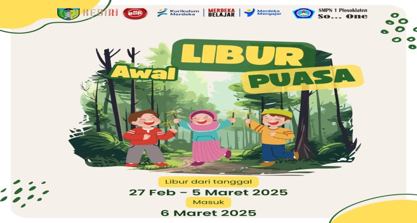 Kepada seluruh siswa dan siswi SMPN 1 PLOSOKLATEN, dalam rangka menyambut bulan suci Ramadan 1446 H, sekolah menetapkan libur awal puasa mulai tanggal 27 Februari - 5 Maret 2025.